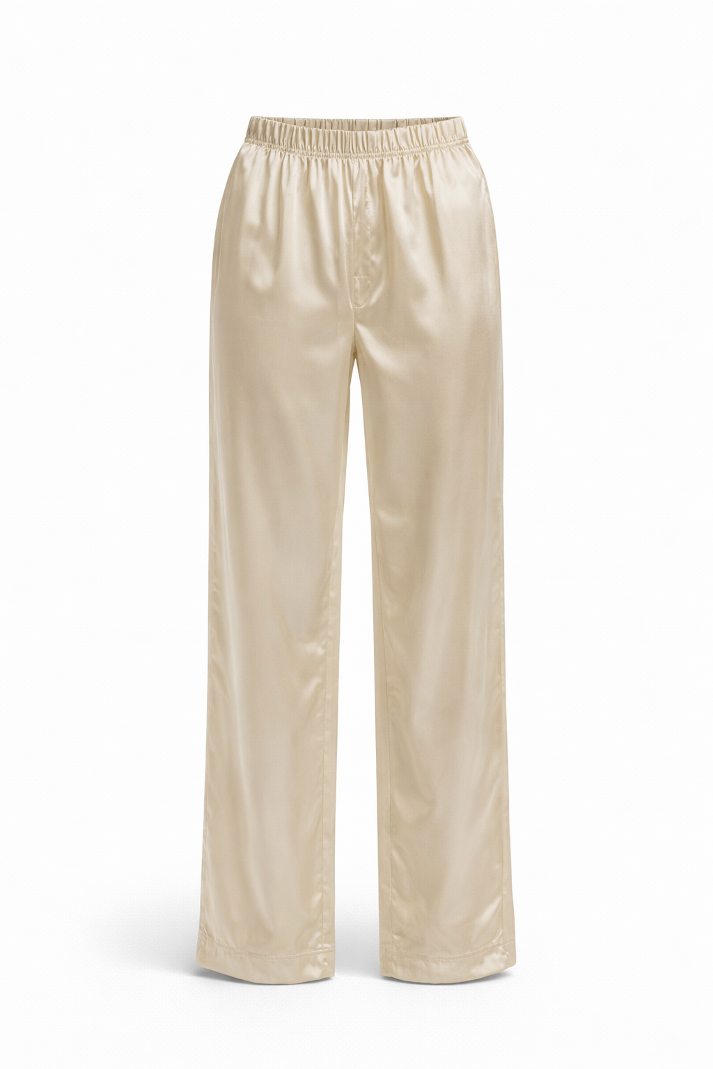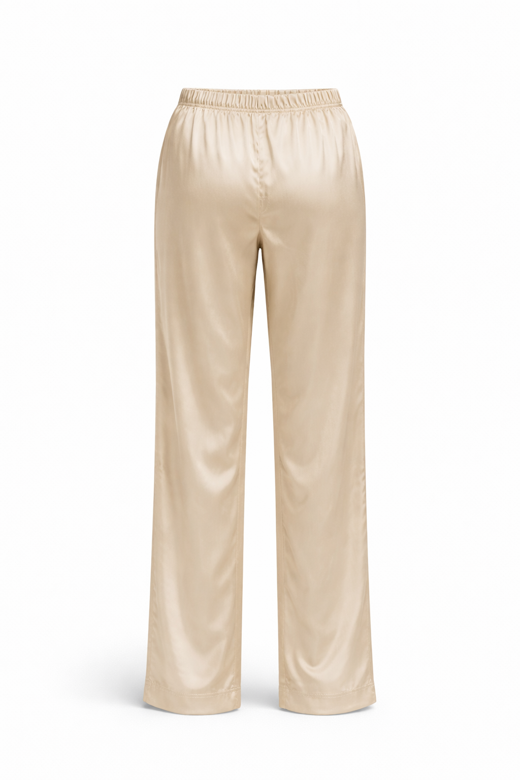 Beige satin pants inspired by the Earth element, symbolizing stability and balance. Designed with a relaxed silhouette and elastic waistband, they offer effortless comfort with refined elegance.