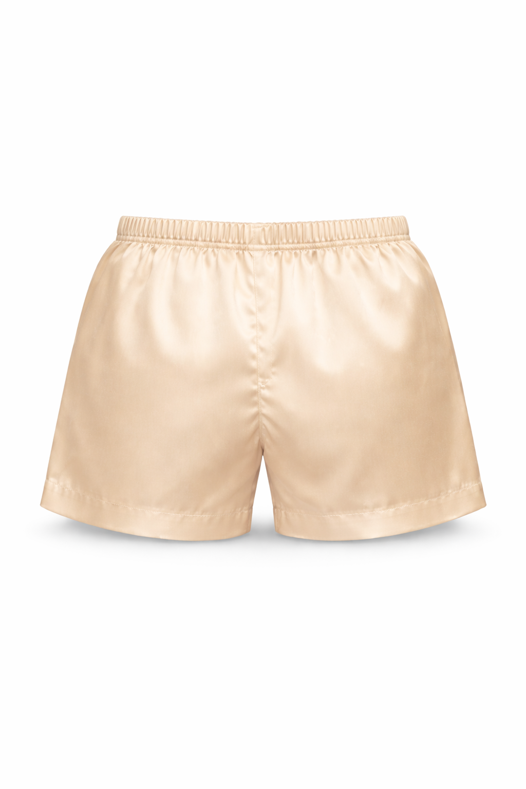 Beige satin shorts inspired by the Earth element, symbolizing stability and balance. Their smooth texture and subtle sheen offer comfort and sophistication, while the elastic waistband ensures a relaxed yet refined fit for elevated lounging.